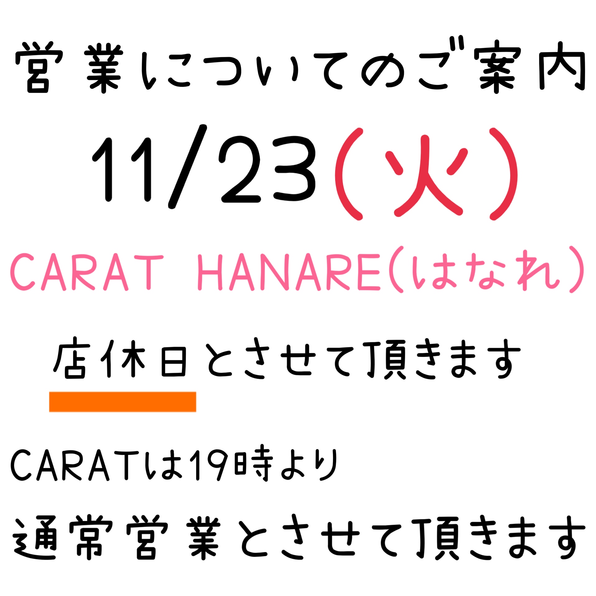 本日ですが、 はなれは店休日とさせて頂きます✨ CARAT(本店)の方は19時より営業しております🙇‍♀️